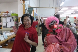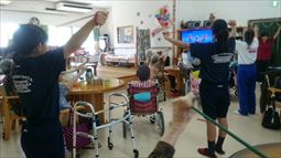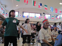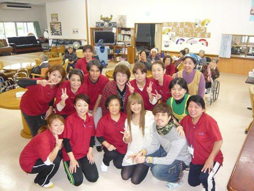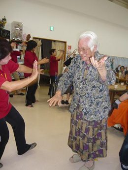 渡嘉敷栄子先生と利用者さんとスタッフとかぎやで風を踊りました |