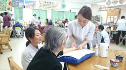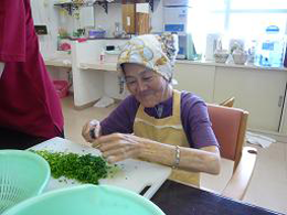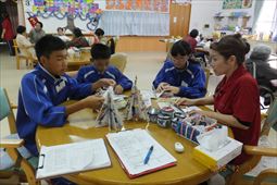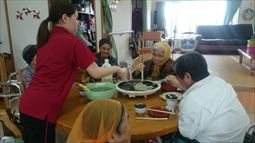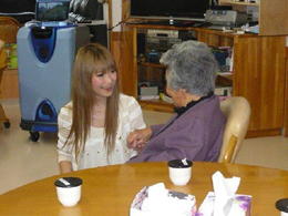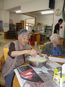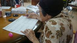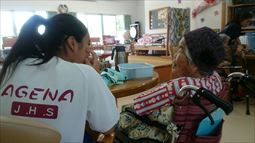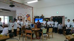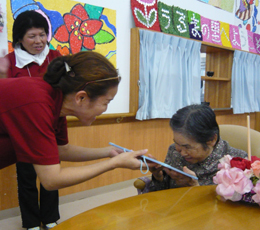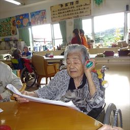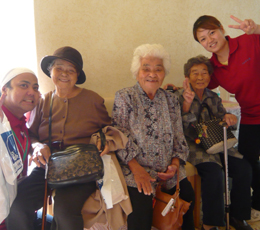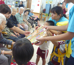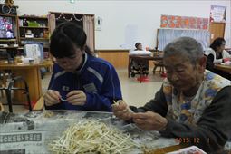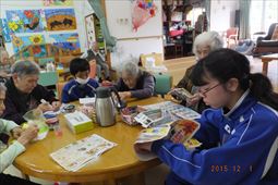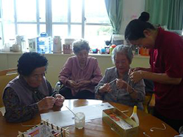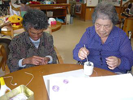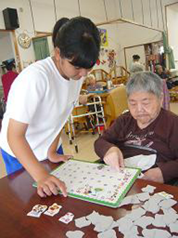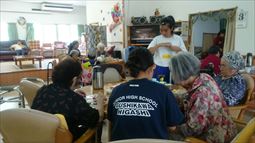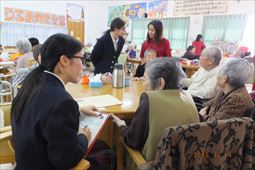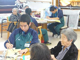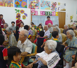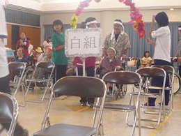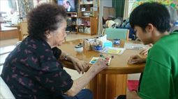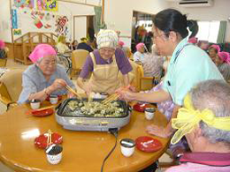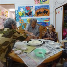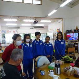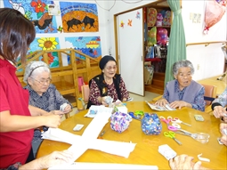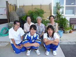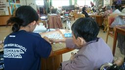 安慶名中学校の職場体験。私たちの何倍も人生を過ごしている大先輩と昔の遊び、沖縄の方言、沖縄料理、これからも残していきたい大切な行事や知恵を利用者さんに教えてもらいながら、年を重ねていくと誰でも体が思うように動かない不便さを考えてお年寄りとの接し方を話し合いながら職場体験をしました。 |