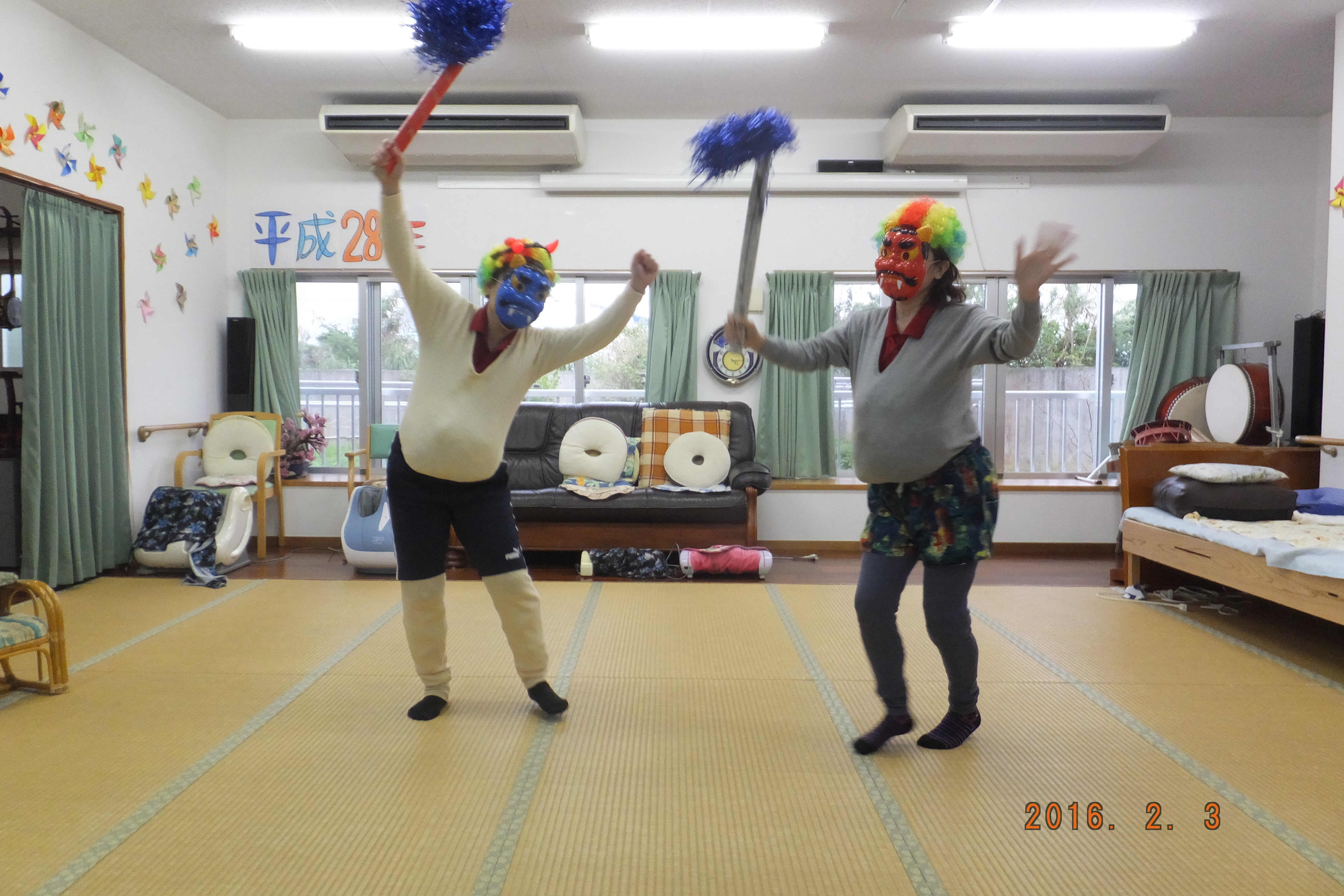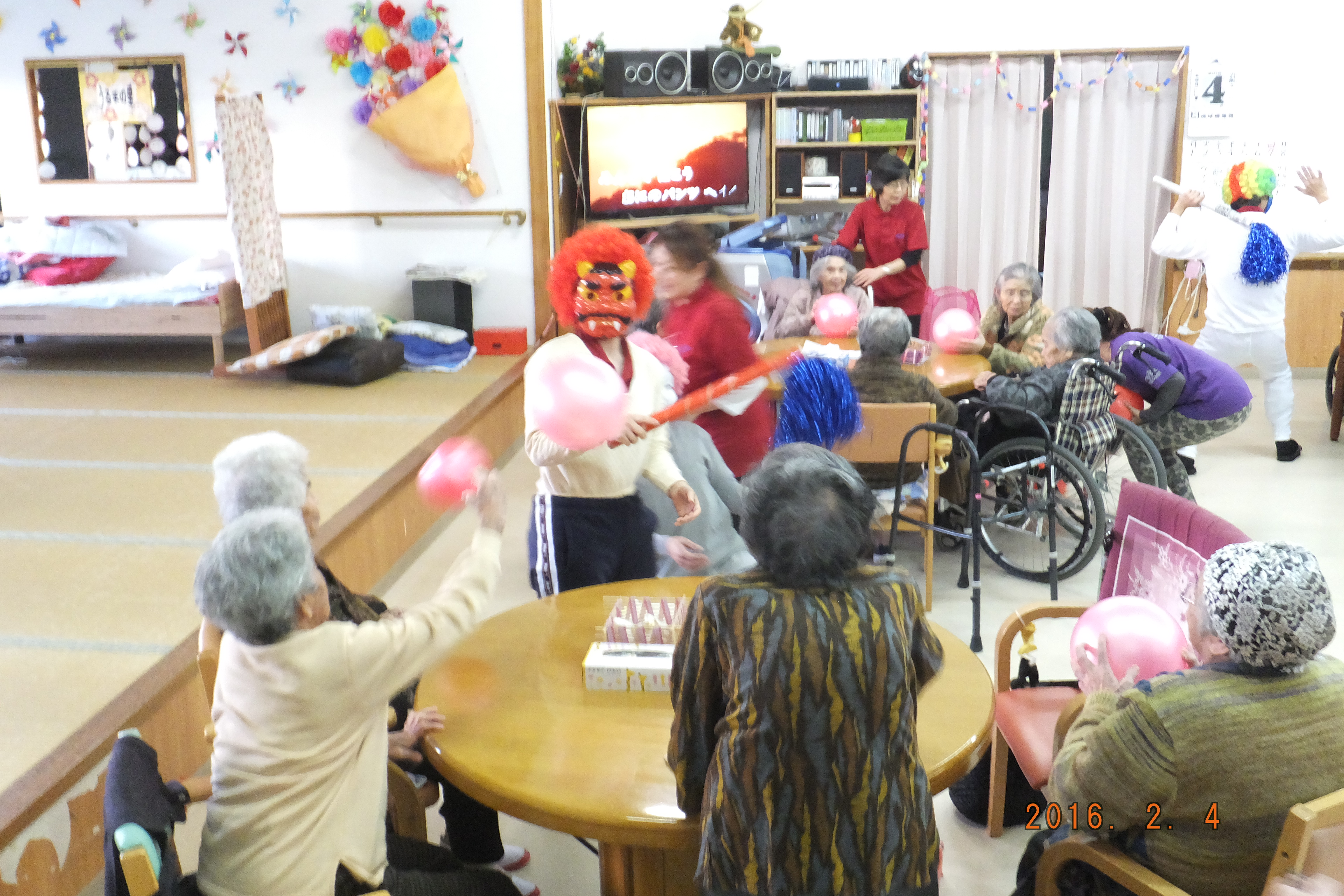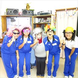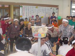 リハビリ体操・赤白はたゲーム・物送り 仮装・お手玉&スカーフ・ボールを使っての運動を行いました!アハハと笑いが絶えない時間です♪
