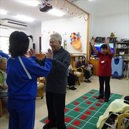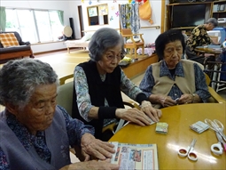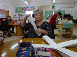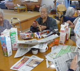 ○12月活動→うちな〜かるた・トランプ・手工芸「末」・棒体操・オセロ・牛乳パックに新聞紙を丸めて入れて足台作りをしてます。
