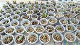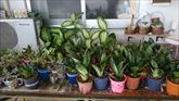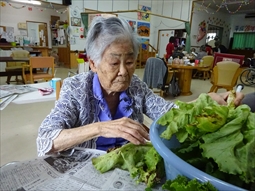 うるまの里の畑にある新鮮な野菜。チキナー・はんだばーを収穫して根っこ取りをしています。