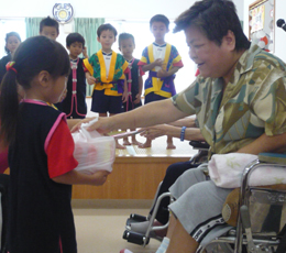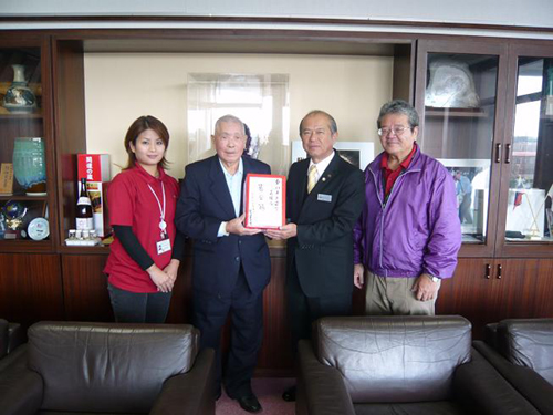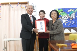 利用者さんから平川氏へ募金箱を手渡ししました。うるまの里では平成23年3月から活動をしています。 日頃、利用さんやご家族から古新聞や段ボールを頂戴しリサイクルし少しずつ募金箱に一年間貯めてきました。これからも出来ることをコツコツと継続していきます!これからもご協力宜しくお願いします。