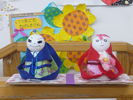 ひな人形を作りました。うるまの里の桜の木の下で